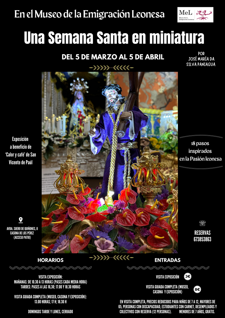 Una magnífica muestra que la acoge durante la Semana Santa el Museo de la Emigración Leonesa, la exposición reúne 18 maquetas inspiradas en algunos de los Pasos más emblemáticos de la Semana Santa leonesa, una colección obra del artesano leonés José María da Silva Paniagua, un gran apasionado de la Semana Santa de León que, desde 2011, que ha realizado las piezas expuestas de manera completamente artesanal.